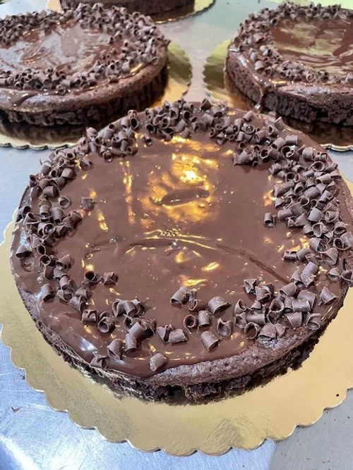 Three layers of Chocolate Cake, filled with Chocolate Mousse, frosted with Chocolate Buttercream, topped with Chocolate Ganache and Chocolate Shavings.