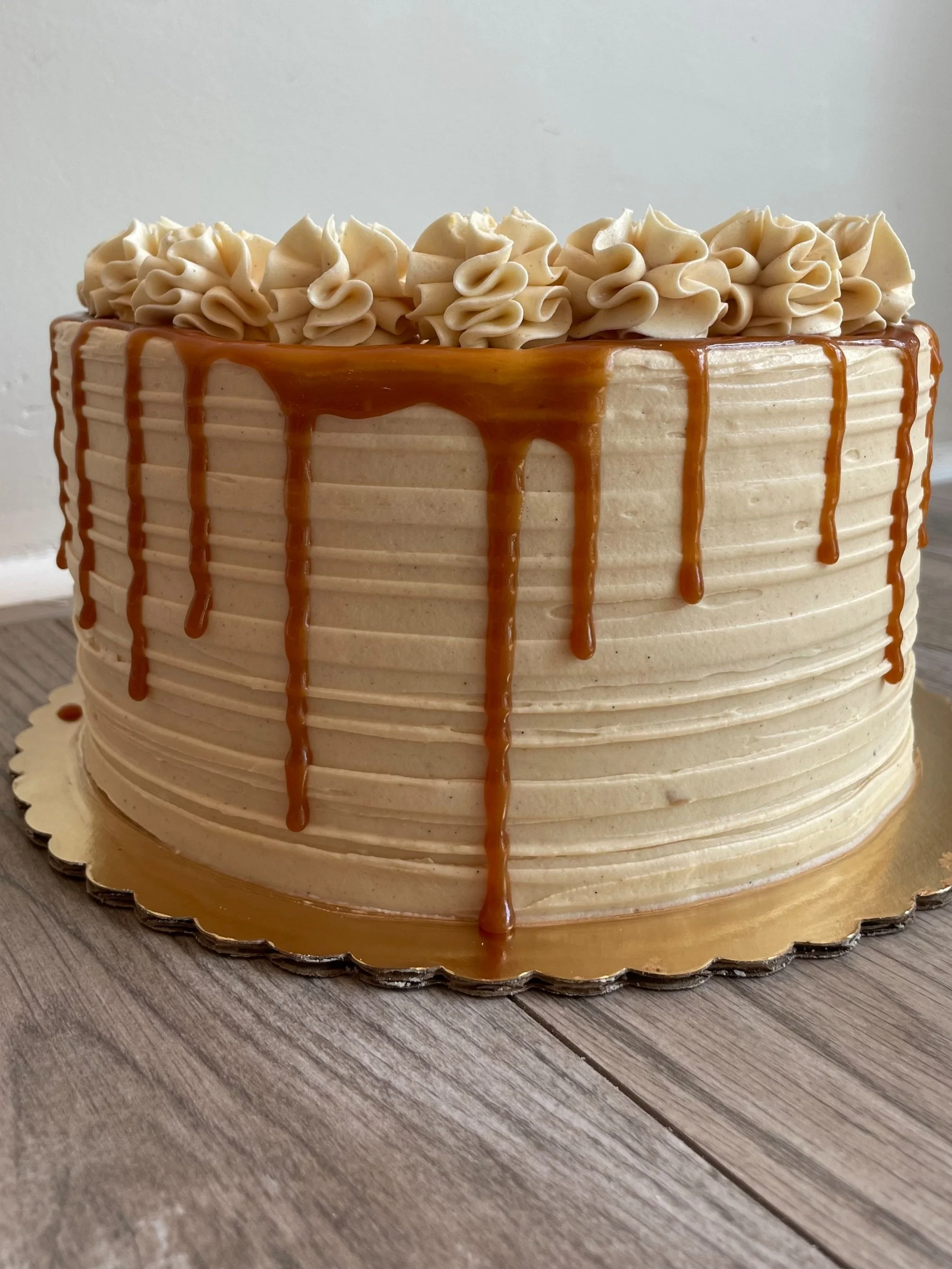 Three layers of our Chocolate Cake, filled with Dulce de Leche, frosted with Peanut Butter Buttercream, topped with homemade Caramel drip.